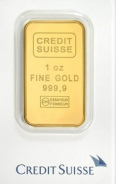 Refined 1 oz gold bar from Credit Suisse, known for its purity and recognized worldwide. Perfect for investors seeking a reliable gold bullion product.